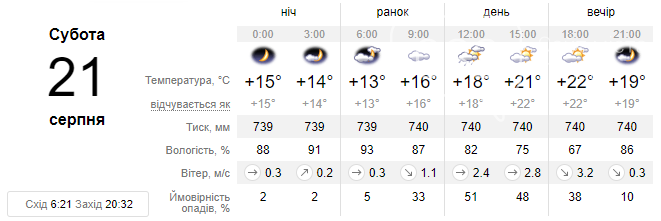 Згідно з інформацією Українського гідрометеорологічного центру, 21 серпня у східних, Запорізькій, Дніпропетровській, Полтавській та Сумській областях грози, в окремих районах град та шквали 15-20 м/с (І рівень небезпечності, жовтий).
