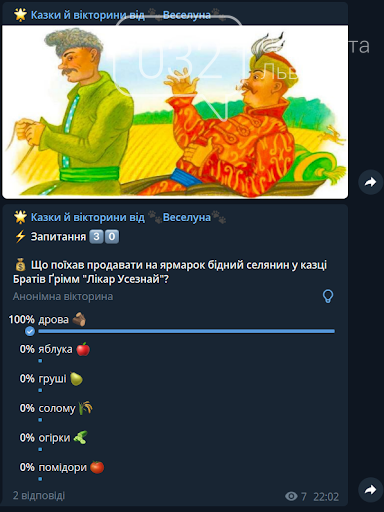 Канал з цікавими вікторинами на казкову тематику: https://t.me/veselun_quiz
