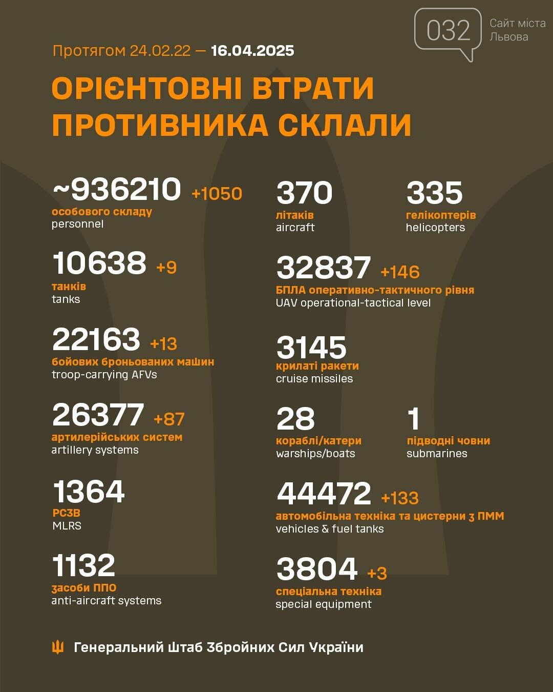 Загальні бойові втрати противника з 24.02.22 по 16.04.25 орієнтовно склали особового складу ‒ близько 936 210 (+1050) осіб.