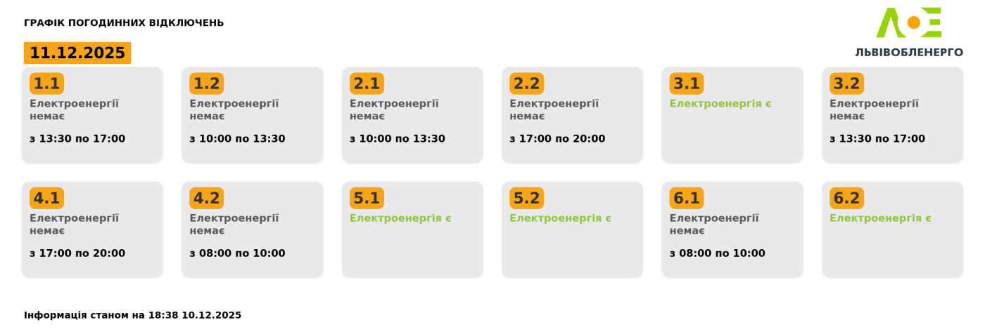 Стали відомі графіки відключення світла у Львові та області на 11 грудня