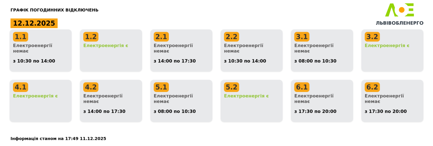 Стали відомі графіки відключення світла у Львові та області на 12 грудня