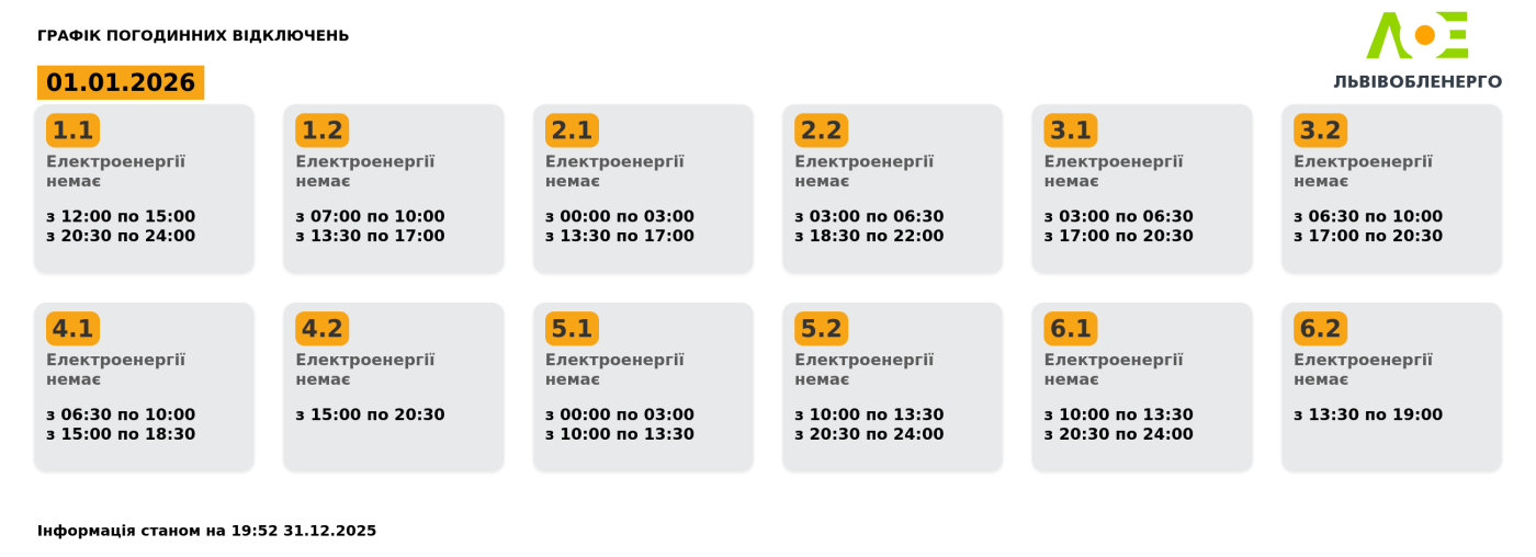 Графік погодинних відключень на 01.01.2026