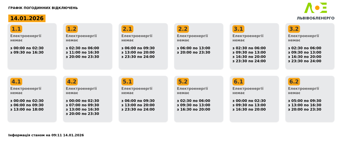 Група 6.1. Електроенергії немає з 00:00 до 02:30, з 09:30 до 13:00, з 16:30 до 20:00.