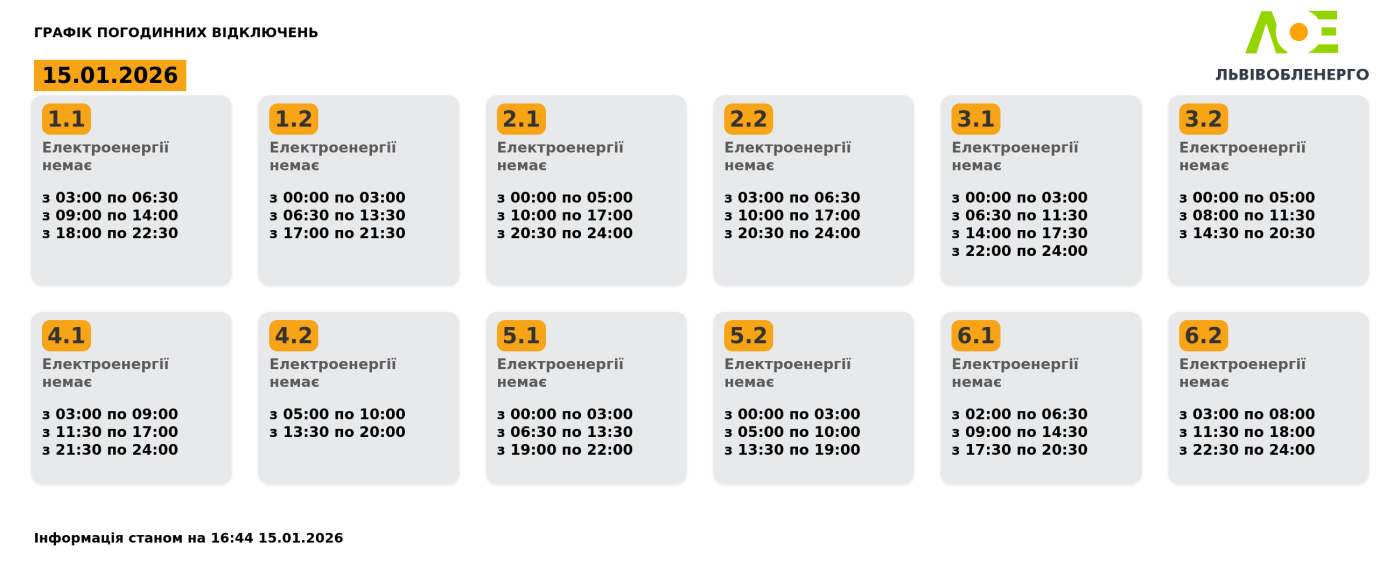 Графік погодинних відключень на 15.01.2026