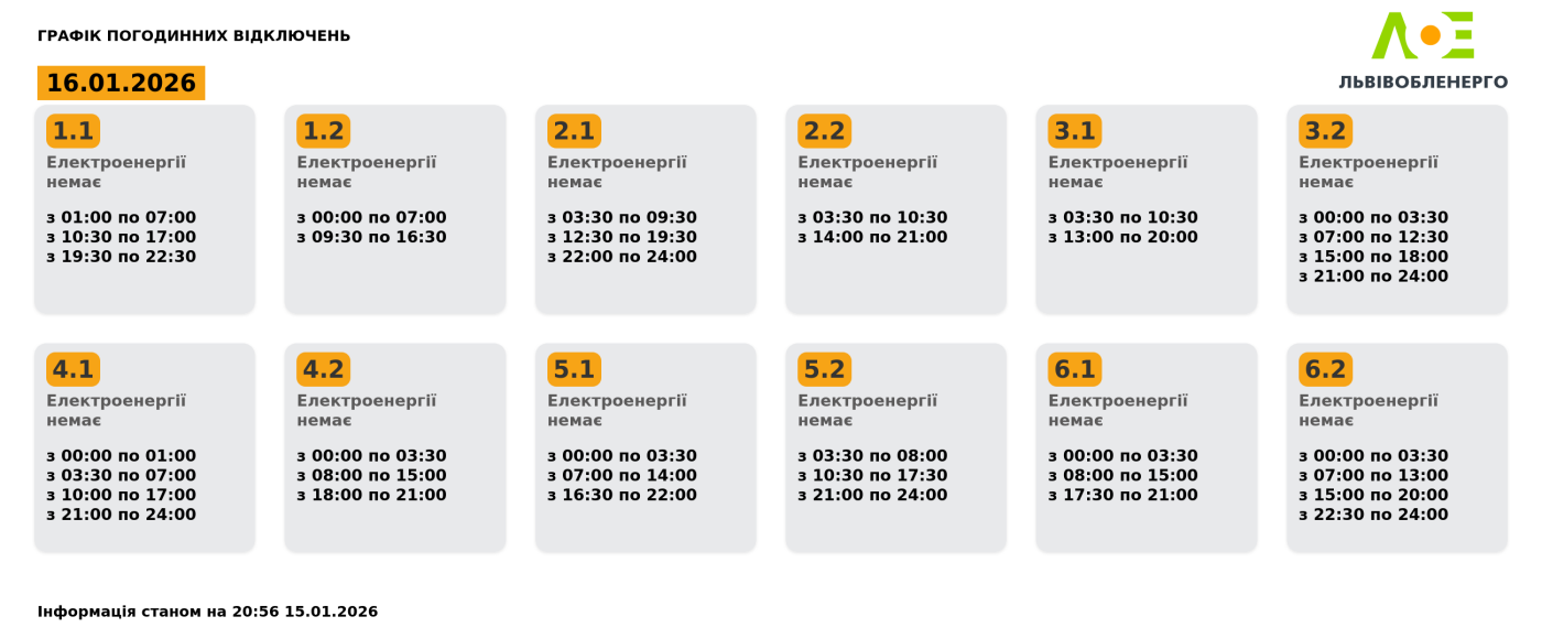 Стали відомі графіки відключення світла у Львові та області на 16 січня