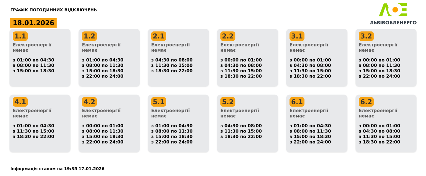 Група 1.1. Електроенергії немає з 01:00 до 04:30, з 08:00 до 11:30, з 15:00 до 18:30.