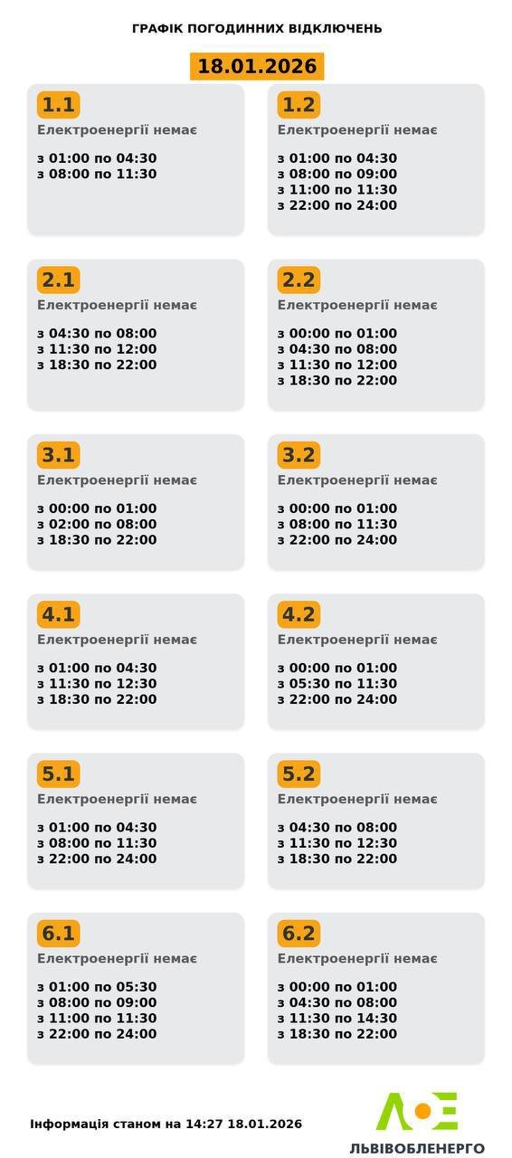 «Львівобленерго» оновило графік відключень світла на неділю, 18 січня.