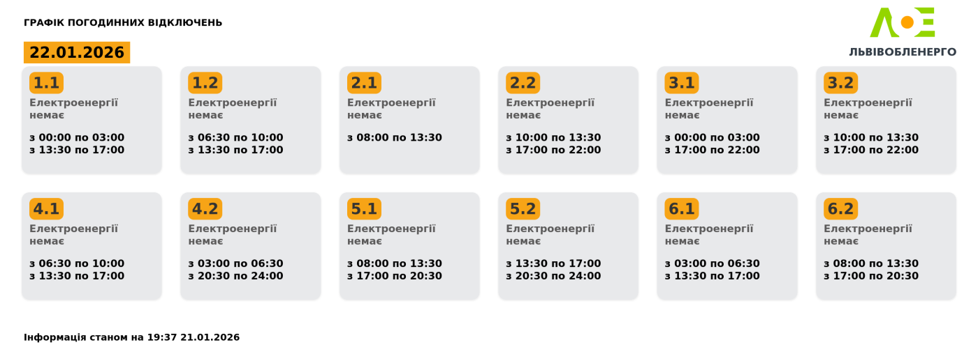 Група 6.2. Електроенергії немає з 08:00 до 13:30, з 17:00 до 20:30.