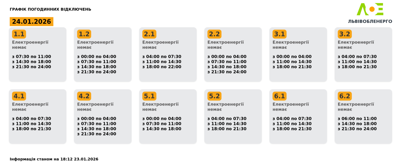 Графік погодинних відключень на 24.01.2026