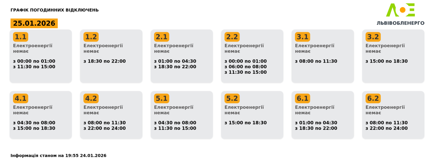 Львові та області оприлюднили графіки відключення електроенергії на 25 січня.