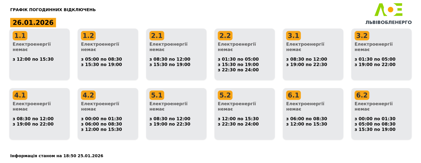 Графік погодинних відключень на 26.01.2026