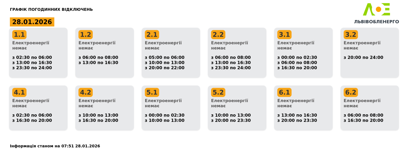 Група 3.1. Електроенергії немає з 00:00 до 02:30, з 06:00 до 08:00, з 16:30 до 20:00.