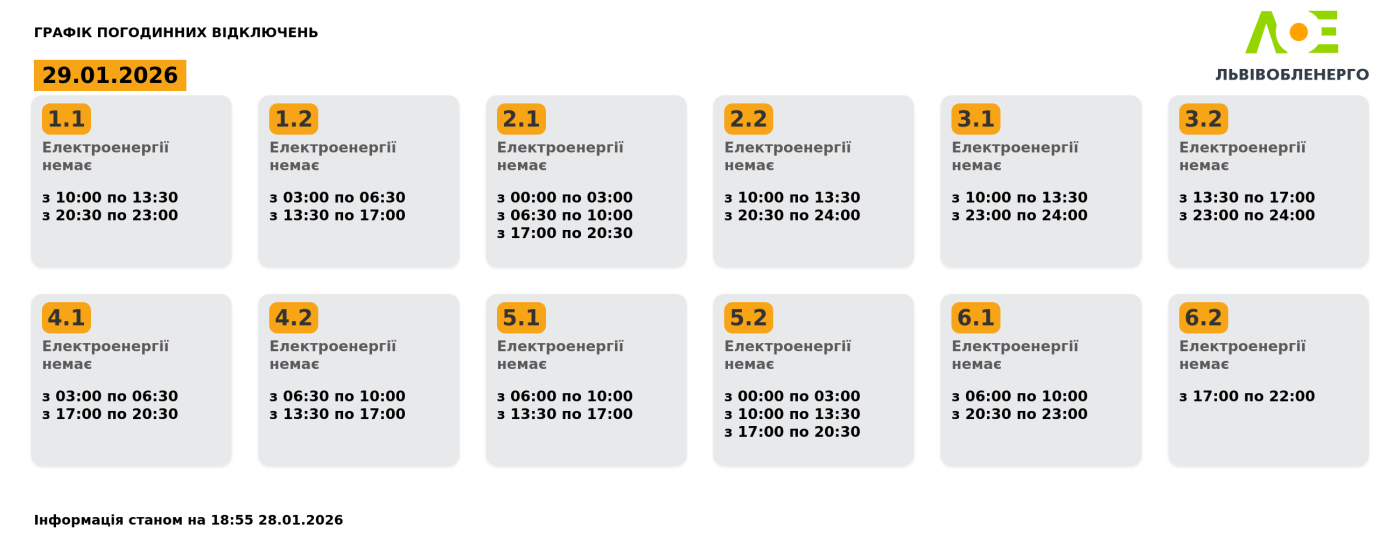 Графік погодинних відключень на 29.01.2026