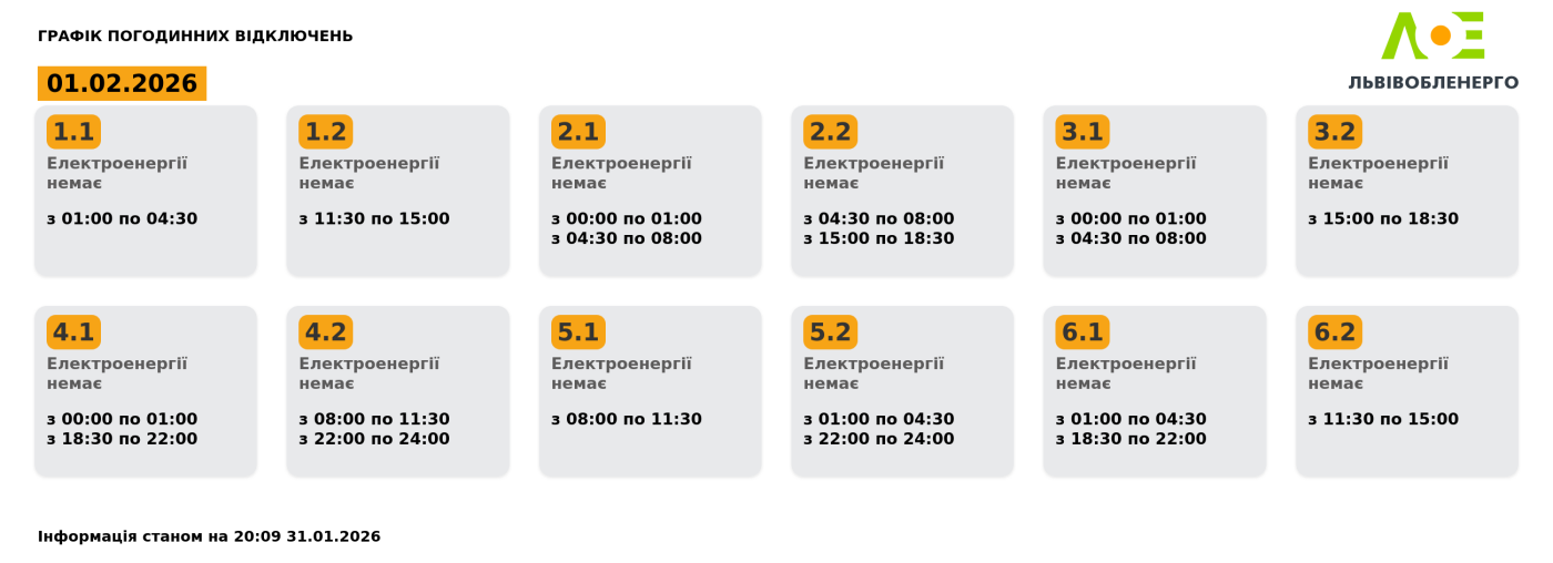 Група 6.1. Електроенергії немає з 01:00 до 04:30, з 18:30 до 22:00.