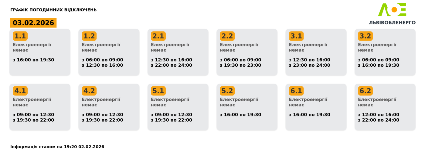 Група 1.2. Електроенергії немає з 06:00 до 09:00, з 12:30 до 16:00.