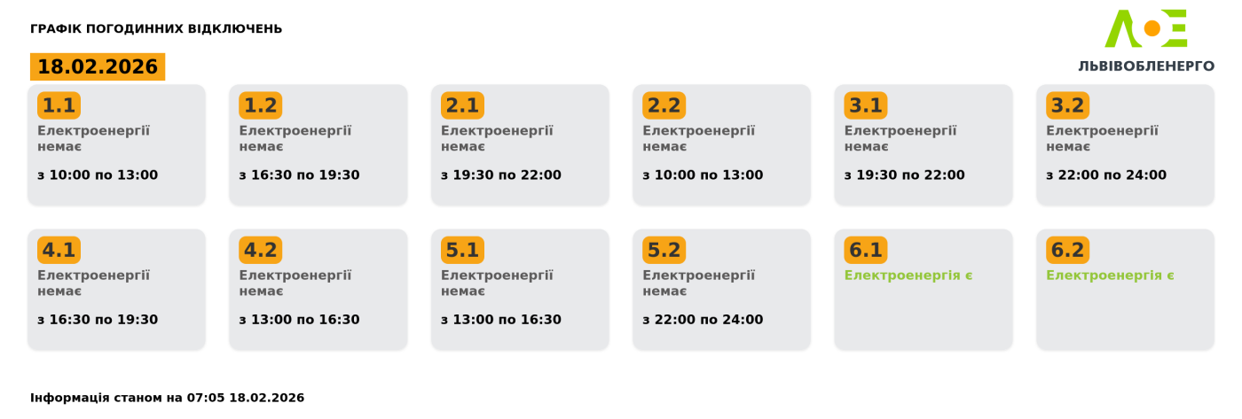 Графік погодинних відключень на 18.02.2026