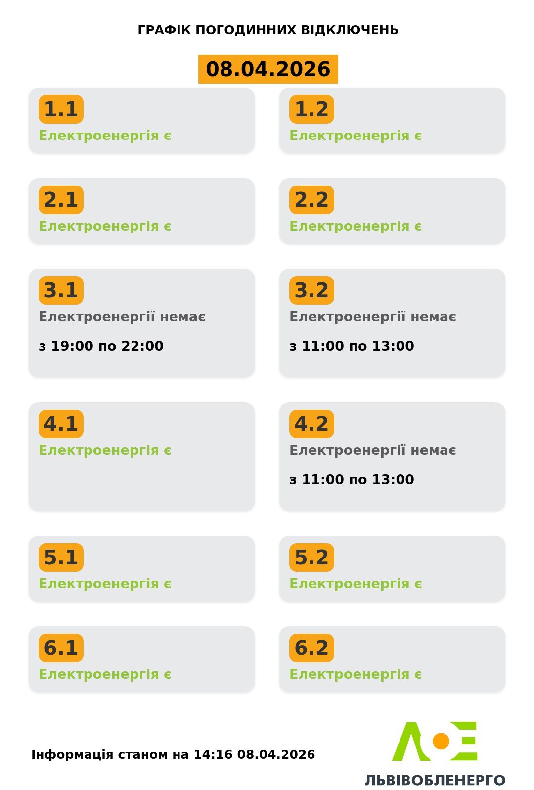 Група 3.2. Електроенергії немає з 11:00 до 13:00.